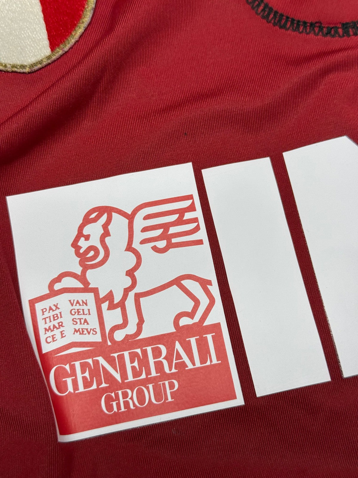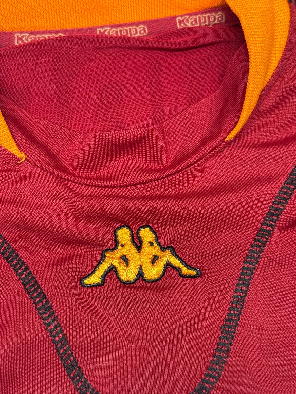 Storica e rara maglia della AS Roma, prodotta dalla Kappa dopo la vittoria dello scudetto. Maglia risalente la stagione 2001 2002, a maniche corte. Presenta lo sponsor Ina Assitalia leggermente screpolato per via dell'età come evidenziato in foto, stemma societario cucito assieme allo scudetto tricolore, celebrativo la vittoria del precedente campionato e logo kappa ricamato nel tessuto, sia centropetto sia lungo le maniche. Presente la toppa di lega sulla manica destra. Impreziosita dalla personalizzazione del giallorosso CANDELA #32.