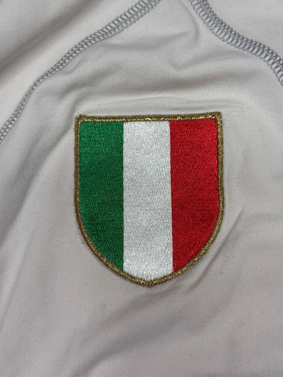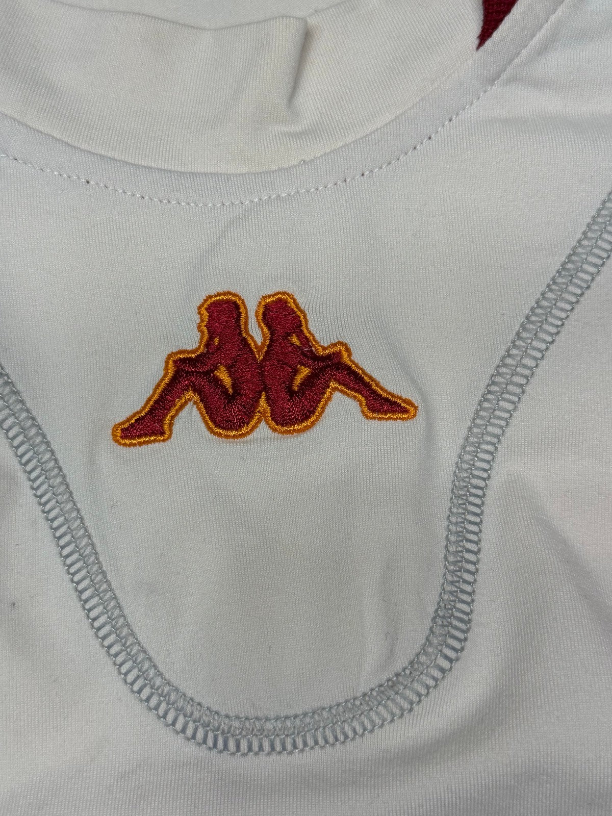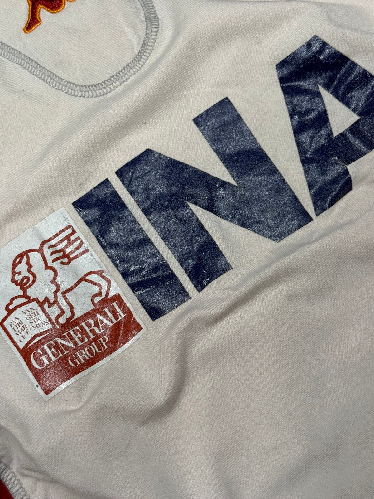 Storica e rara maglia della AS Roma, prodotta dalla Kappa dopo la vittoria dello scudetto. Maglia risalente la stagione 2001 2002, a maniche corte. Presenta lo sponsor Ina Assitalia leggermente screpolato per via dell'età come evidenziato in foto, stemma societario cucito assieme allo scudetto tricolore, celebrativo la vittoria del precedente campionato e logo kappa ricamato nel tessuto, sia centropetto sia lungo le maniche. Presente la toppa di lega sulla manica destra. Impreziosita dalla personalizzazione del capitano giallorosso TOTTI #10