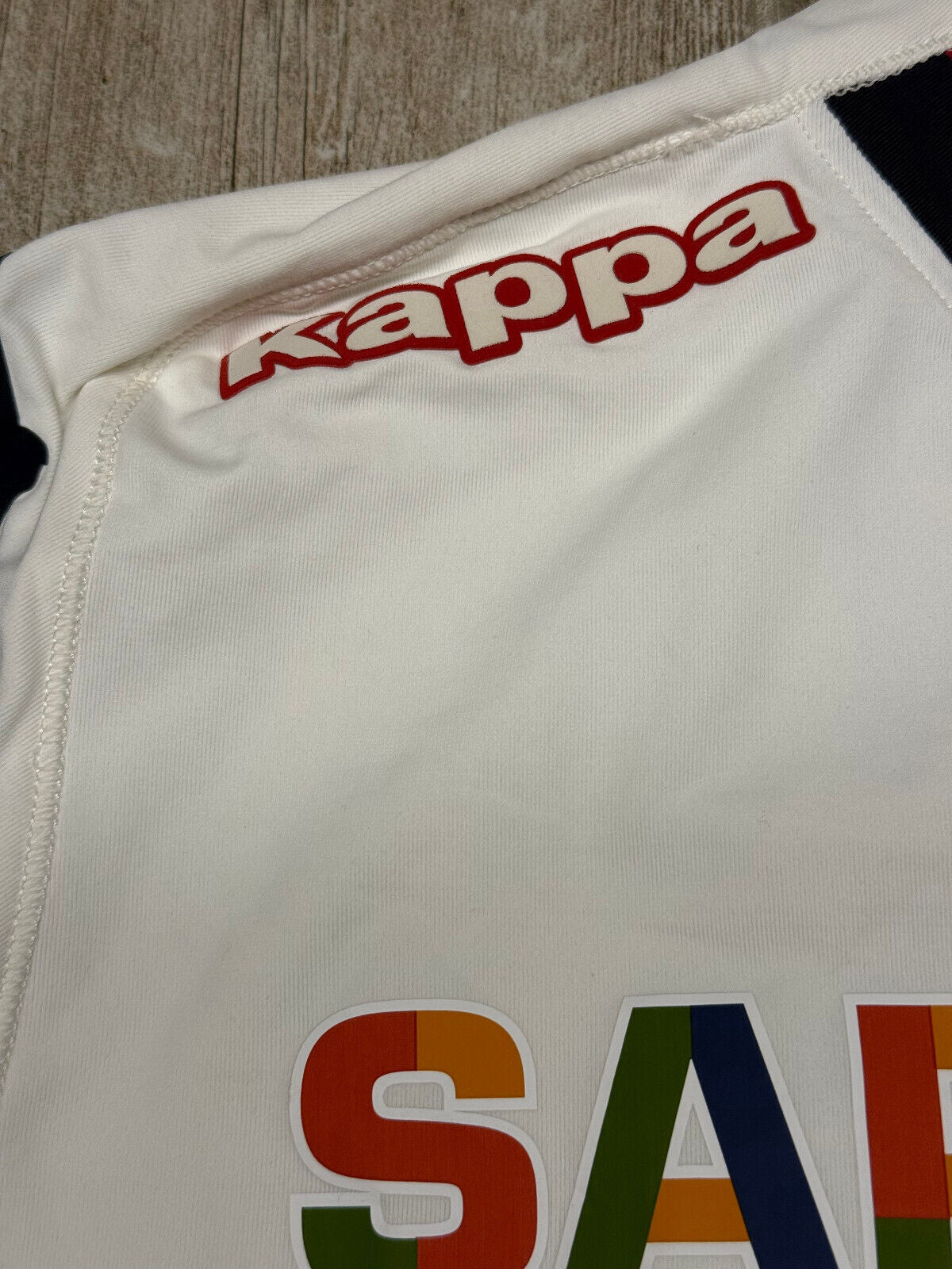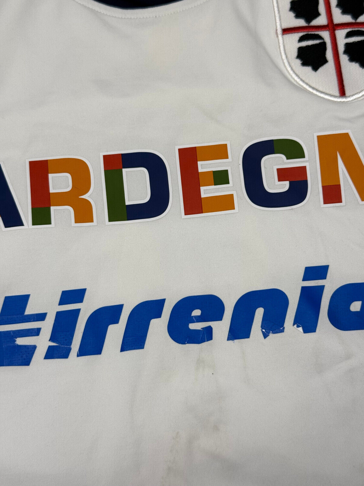 Rara maglia prodotta da Kappa per il Cagliari calcio in vista della stagione 2012 2013. Modello away utilizzato nelle gare in trasferta dal club, impreziosita dalla personalizzazione dell'ex calciatori Davide Astori sul retro. Frontalmente lo stemma societario e ricamato, lo sponsor applicato in plastica e presenta delle defezioni sulle lettere "Tirrenia" (vedere foto). Taglia M. Condizioni generali buone considerata l'età e che l'articolo è di seconda mano. Patch lega calcio serie A lungo la manica destra.