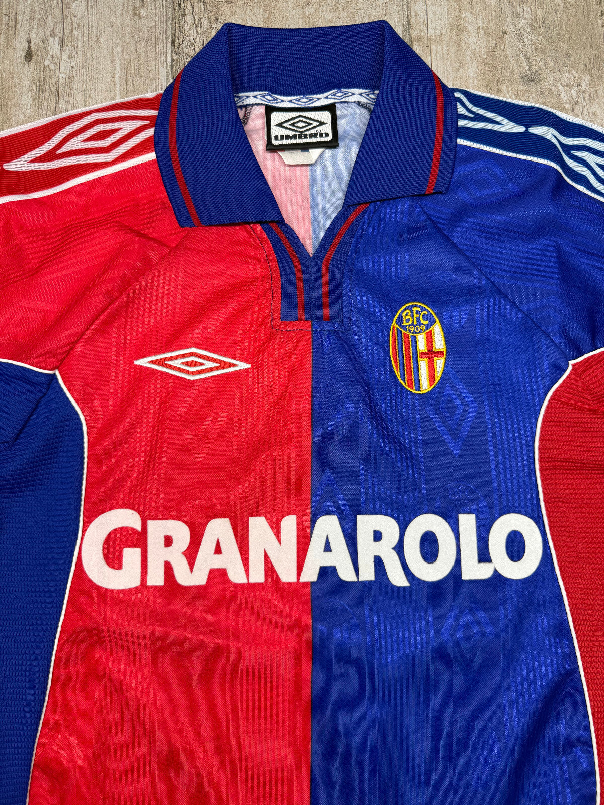 Rara e storica prima divisa da gioco del Bologna calcio. Prodotta dalla UMBRO nel 2000-2001, la maglia si presenta a maniche corte, in eccellenti condizioni con personalizzazione di SIGNORI. Sponsor GRANAROLO in rilievo e logo umbro anch'esso in rilievo, stemma societario cucito sul petto.