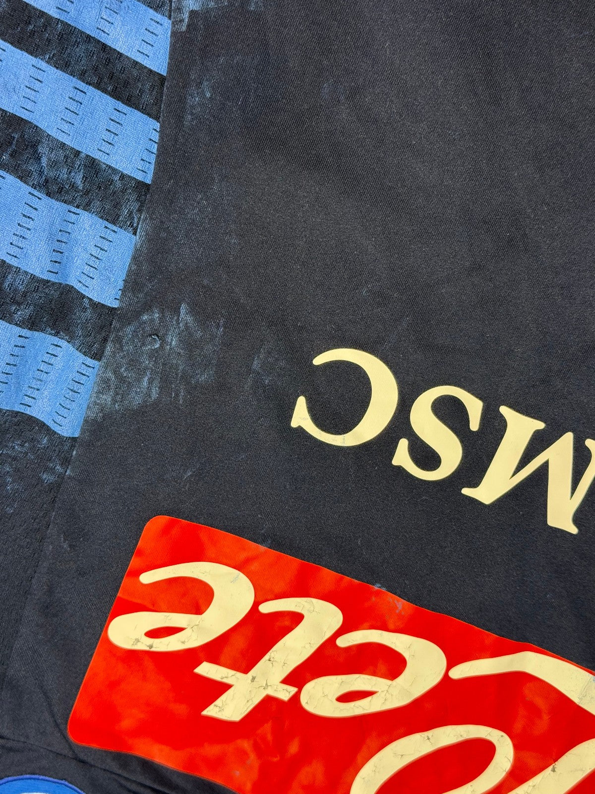 Rara maglia del SSC Napoli, prodotta dalla macron nella stagione 2012 2013. Versione home a maniche lunghe, taglia L. Sponsor Lete e MSC Crociere applicati frontalmente, logo napoli e macron ricamati, coccarda tricolore celebrativa la vittoria della coppa italia cucita sul petto. Loghi macron sulle spalle in condizioni come da foto consumati dal tempo.